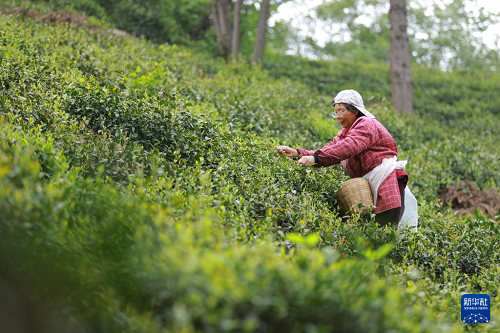 4月20日,在河南省信陽市浉河區(qū)浉河港鎮(zhèn)郝家沖村何家寨茶山,茶農在采摘信陽毛尖。(新華社發(fā) 聶品 攝)