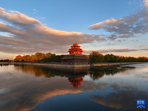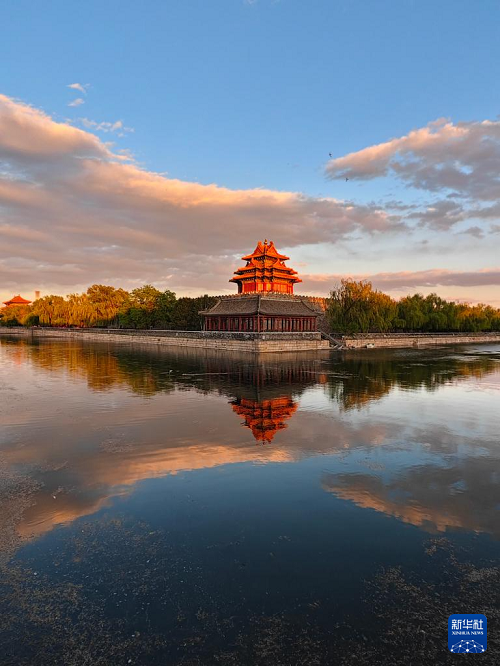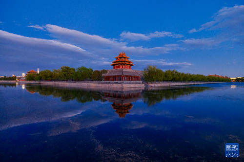 4月27日,暮色中的故宮角樓景色如畫,引人入勝。