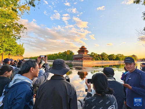 4月27日,游客欣賞故宮角樓(手機(jī)照片)。(新華社記者 徐金泉 攝)