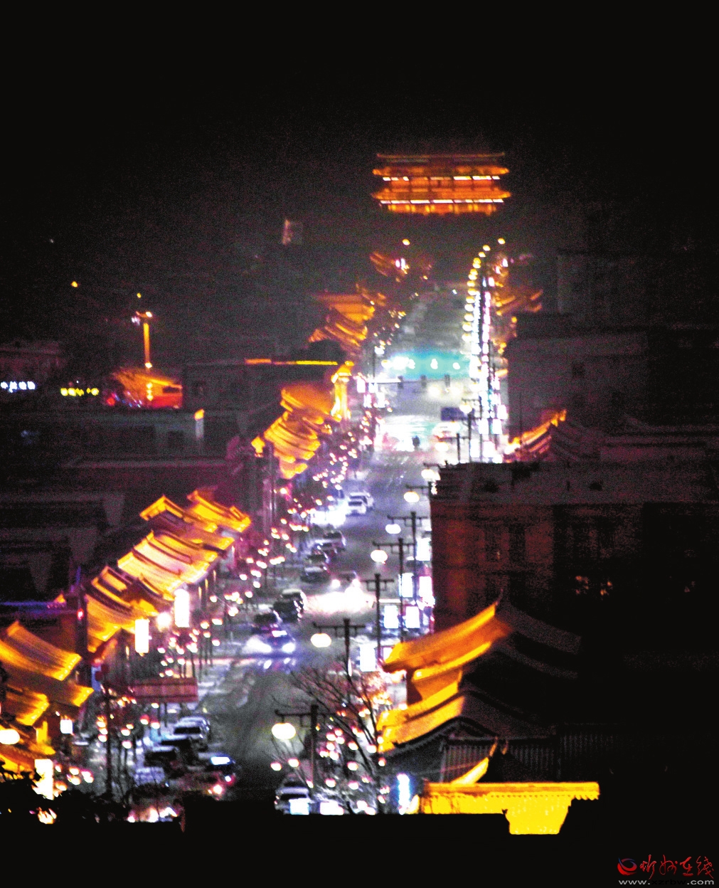 3月19日,我市普降瑞雪,雪后的忻州古城銀裝素裹,古建民居和燈火璀璨的夜景相互輝映,宛如畫(huà)卷。(趙晨善 攝)