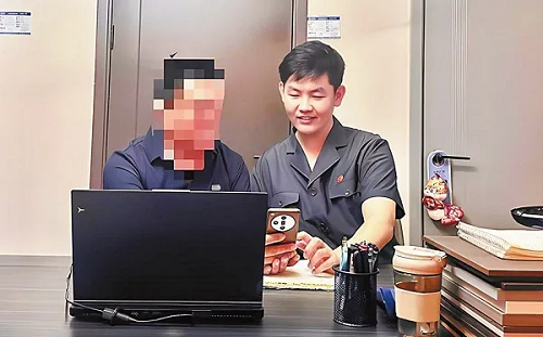 圖為山西省忻州市忻府區(qū)人民法院執(zhí)行局法官助理張曜赟同被執(zhí)行人米某交流案情。尹振帆 攝