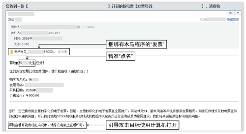 “【電子發(fā)票】張某某先生,您的發(fā)票已開好,請點(diǎn)擊下載”——當(dāng)收件箱彈出這類帶著你真實(shí)姓名的電子郵件,你是否會下意識點(diǎn)擊?注意!這可能是境外間諜情報(bào)機(jī)關(guān)實(shí)施的精準(zhǔn)網(wǎng)絡(luò)攻擊。一旦點(diǎn)擊郵件中的附件或者鏈接,設(shè)備將瞬間淪為間諜竊密的“突破口”,安全風(fēng)險(xiǎn)隨之而來。