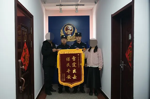 3月16日,被救助男子家屬專程來到定襄縣公安局巡特警大隊,將一面印有“雷霆出擊 保民平安”大字的錦旗鄭重交到民輔警手中,言辭懇切,感激之情溢于言表。