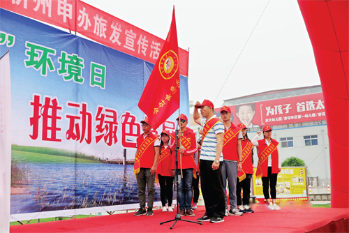 6 月5 日上午,第四十五個(gè)世界環(huán)境日宣傳活動(dòng)在我市體育廣場舉行。圍繞“改善環(huán)境質(zhì)量,推動(dòng)綠色發(fā)展”主題,市環(huán)保局開展了百人騎行、文藝演出、助力忻州旅游投票等活動(dòng)。圖為我市環(huán)保志愿者協(xié)會(huì)志愿者代表正在宣誓。(王君 攝)
