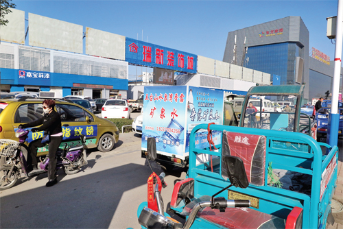 瑞新裝飾城外機(jī)動(dòng)車、三輪車占用人行道、盲道亂停亂放。