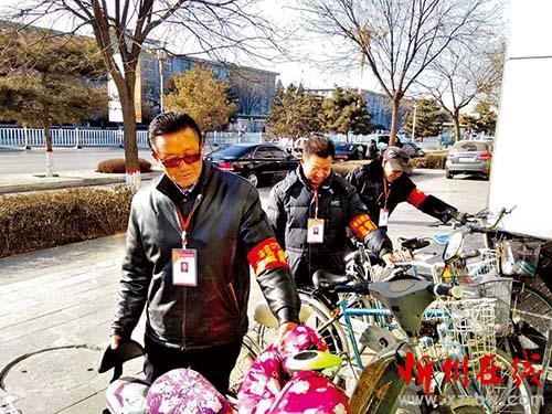 張明亮(中)與隊(duì)員們整理街頭的自行車