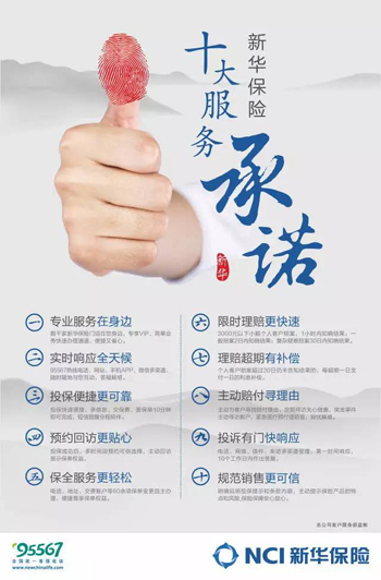 數(shù)十萬新華人滿懷誠意向您莊嚴宣誓“十大服務(wù)承諾”,竭誠為您提供便捷、專業(yè)的保險金融服務(wù)!