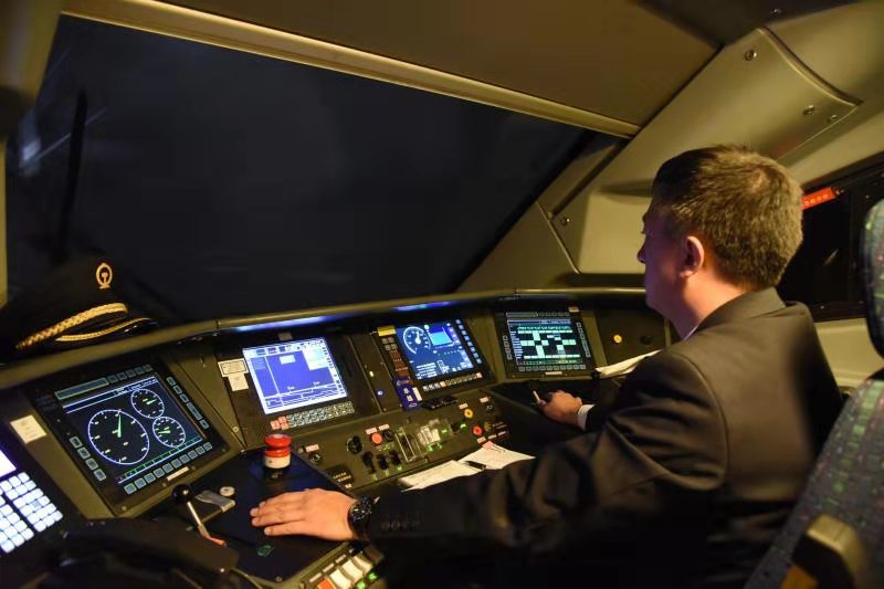 當(dāng)D6770次列車到達呼和浩特東站,弓國慶登上機車,與換班司機交接完畢后,插入IC卡,認真核對行車數(shù)據(jù)、確認操縱臺各儀表……各項安全準備工作無誤后,隨著機車前方發(fā)車信號變?yōu)榫G燈,與車站進行車機聯(lián)控確認,隨著一聲汽笛長鳴,動車組緩緩駛出呼和浩特東站。“徹底瞭望,確認信號,高聲呼喚,手比眼看”的標準化作業(yè)與每三十秒腳踩提醒踏板的一系列操作流暢默契……盡管這種周而復(fù)始的工作他已重復(fù)了成千上萬遍,但從不敢松懈。