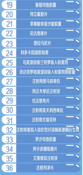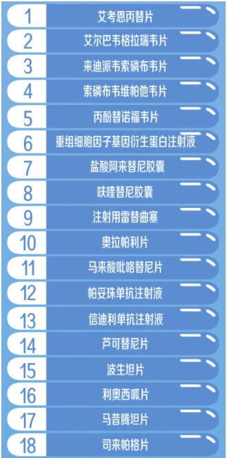 國家醫(yī)保局醫(yī)藥服務(wù)管理司司長熊先軍介紹,此次談判成功的藥品多為近年來新上市且具有較高臨床價值的藥品,涉及癌癥、罕見病、風(fēng)濕免疫、心腦血管、消化等10余個臨床治療領(lǐng)域。重點領(lǐng)域的5個基本藥物全部談判成功,22個抗癌藥、7個罕見病用藥、14個慢性?。ê悄虿?、乙肝、風(fēng)濕性關(guān)節(jié)炎等)用藥、4個兒童用藥談判成功,進(jìn)一步優(yōu)化了目錄結(jié)構(gòu)。
