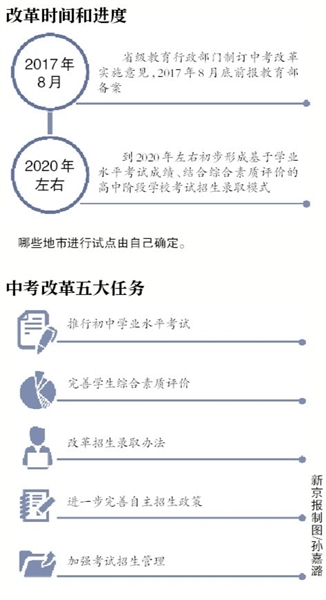 根據(jù)安排,省級教育行政部門負(fù)責(zé)制訂中考改革實(shí)施意見,并于2017年8月底前報教育部備案。同時,綜合改革試點(diǎn)將從2017年之后入學(xué)的初中一年級學(xué)生開始實(shí)施,目前初中在校生、非試點(diǎn)地市仍執(zhí)行原來的考試招生辦法。