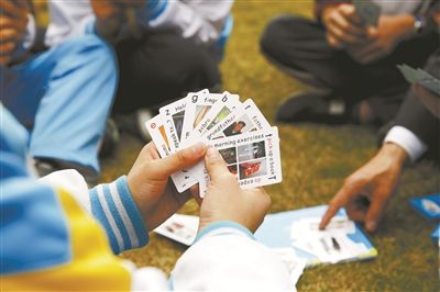 學(xué)生們?cè)谕嫣锞虐l(fā)明的“英語撲克”。劉磊 攝