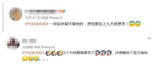 自2015年2月至今,新浪微博“#節(jié)后綜合癥#”的話題主頁(yè)持續(xù)有新帖發(fā)布,總閱讀量超過(guò)1000萬(wàn)。節(jié)后第一天尚未到來(lái),已經(jīng)有網(wǎng)友發(fā)帖抱怨“一早起來(lái)暈天暈地的”“好想睡他個(gè)昏天暗地”。