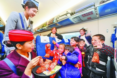 1月24日,在重慶開往福州的G1755次列車上,乘務(wù)員和“小候鳥”做游戲。春運(yùn)期間,大批務(wù)工人員子女隨長輩踏上與父母團(tuán)聚的旅途,南鐵福州客運(yùn)段提前對(duì)重點(diǎn)線路乘務(wù)組進(jìn)行兒童陪護(hù)培訓(xùn),在列車上準(zhǔn)備了書本和玩具,用愛心護(hù)航“小候鳥”的團(tuán)圓路。新華社記者 宋為偉攝