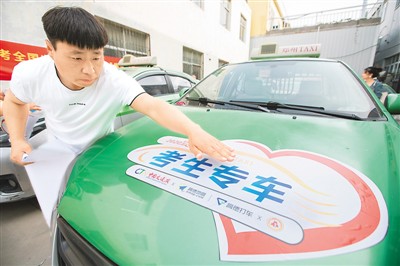 網(wǎng)絡(luò)出行平臺(tái)高德打車聯(lián)合有關(guān)方面推出“愛心送考 ”免費(fèi)服務(wù)。圖為參與提供服務(wù)的工作人員給車貼相關(guān)標(biāo)識(shí)。