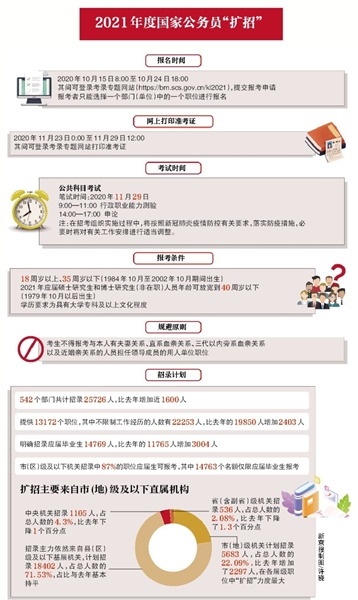 昨日,國家公務(wù)員局發(fā)布公告,今日8時起至10月24日18時,可報名中央機(jī)關(guān)及其直屬機(jī)構(gòu)2021年度考試。542個部門共計招錄25726人,比去年增加近1600人。明確招錄應(yīng)屆畢業(yè)生14769人,比去年增加3004人。