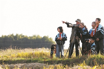 圖為在位于安徽省池州市的十八索省級(jí)自然保護(hù)區(qū),茅坦小學(xué)的學(xué)生在野生鳥(niǎo)類(lèi)保護(hù)志愿者的帶領(lǐng)下用相機(jī)記錄鳥(niǎo)類(lèi)。