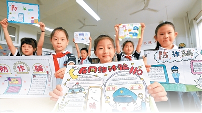 河北省邯鄲市復(fù)興區(qū)陽(yáng)春小學(xué)的學(xué)生們展示網(wǎng)絡(luò)安全主題手抄報(bào)。郝群英攝(人民視覺(jué))