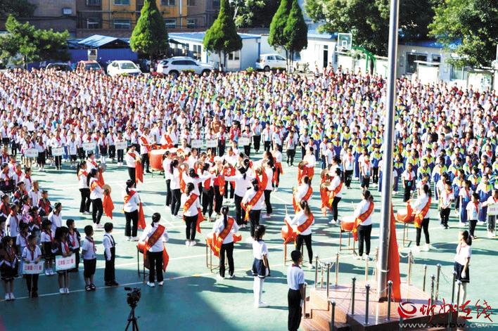 10日上午,統(tǒng)一著裝的少先隊員們精神抖擻地站在校門口廣場,以快閃告白的方式,齊誦贊美老師的詩詞,向全校老師致以最誠摯的告白。