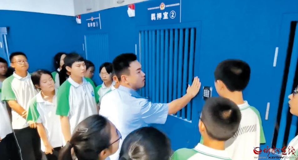 法院干警向?qū)W生們展示警用器械,詳細(xì)介紹了八件套、電子腳銬、束縛帶、盾牌等常用器械的使用方法和適用場合。大家聽完后,顯示出濃厚興趣,躍躍欲試,在法警叔叔的指導(dǎo)下,體驗了各類警用器械。之后,學(xué)生們還參觀了羈押室。