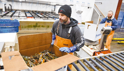 在美國(guó)緬因州波特蘭附近的海岸龍蝦公司,兩名工人正在把龍蝦裝箱。新華社發(fā)