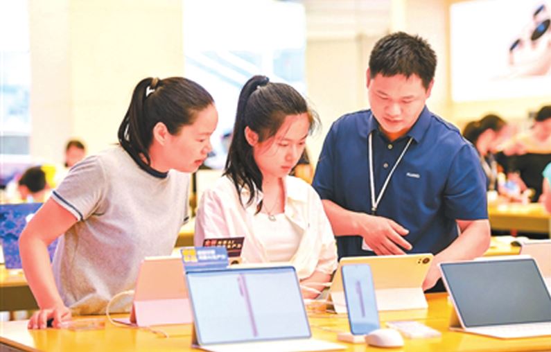 在江西省宜春市袁州區(qū)潤(rùn)達(dá)國(guó)際購(gòu)物中心的電子數(shù)碼產(chǎn)品專(zhuān)營(yíng)店內(nèi),工作人員向消費(fèi)者介紹平板電腦產(chǎn)品。