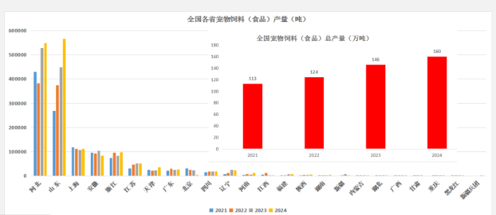 據(jù)中國飼料工業(yè)協(xié)會(huì)最新統(tǒng)計(jì),2024年山東省寵物食品產(chǎn)量達(dá)56.6萬噸,超越河北,東北地區(qū)亦呈新興發(fā)展態(tài)勢(shì)。王宗禮稱,寵物產(chǎn)業(yè)集群效應(yīng)顯著,依托原料、區(qū)位等優(yōu)勢(shì)實(shí)現(xiàn)集群化發(fā)展。山東、河北產(chǎn)量占全國近70%,長(zhǎng)三角占21%。