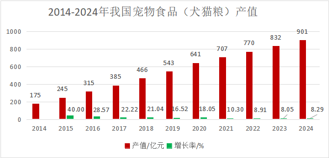 中國農(nóng)業(yè)科學(xué)院飼料研究所寵物營(yíng)養(yǎng)團(tuán)隊(duì)數(shù)據(jù)統(tǒng)計(jì)顯示,2024年我國寵物犬貓飼養(yǎng)量達(dá)1.4億只,寵物產(chǎn)業(yè)總規(guī)模突破3000億元,其中寵物食品市場(chǎng)占比最高。到2024年,寵物食品犬貓糧市場(chǎng)規(guī)模達(dá)到900億元,比2023年增長(zhǎng)8.3%。