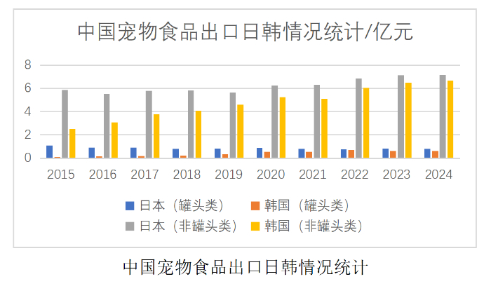 王金全分析認(rèn)為,日韓是我國寵物食品重要出口地,2022年占出口總額12%,中國品牌憑性價(jià)比與差異化切入日本市場(chǎng),2024年對(duì)韓非罐裝類出口額較2015年翻倍。