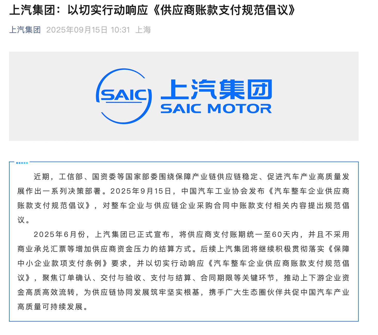 央廣網(wǎng)北京9月15日消息(記者董楠)9月15日,中國汽車工業(yè)協(xié)會(簡稱“中汽協(xié)”)發(fā)布《汽車整車企業(yè)供應(yīng)商賬款支付規(guī)范倡議》,提出為了推動汽車行業(yè)落實《保障中小企業(yè)款項支付條例》,支持重點車企高質(zhì)量踐行供應(yīng)商賬期承諾,在充分協(xié)商的基礎(chǔ)上,對整車企業(yè)與供應(yīng)商企業(yè)采購合同中賬款支付相關(guān)內(nèi)容作出規(guī)范倡議,規(guī)范涉及訂單確認(rèn)、交付與驗收、支付與結(jié)算、合同期限多個環(huán)節(jié)。