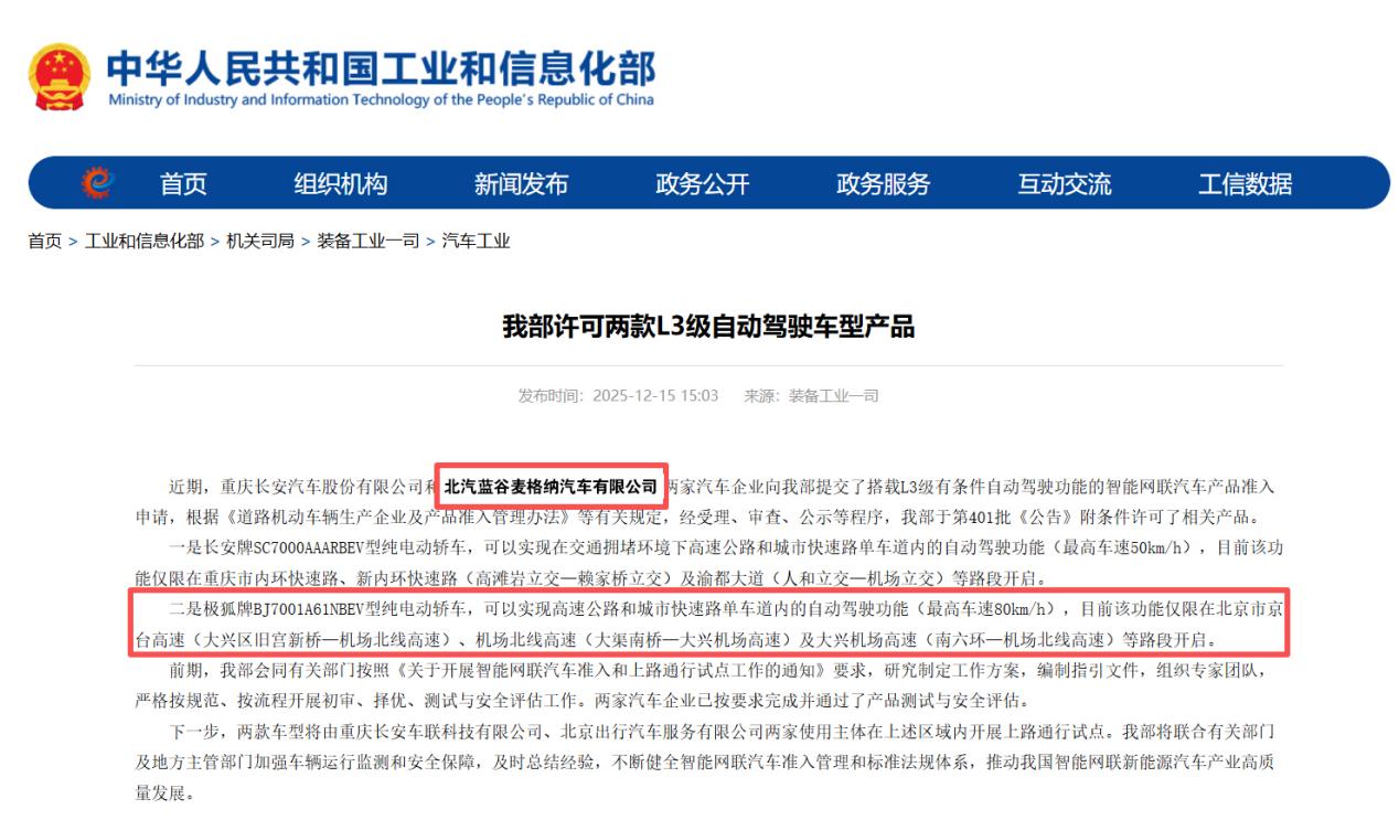 12月15日,北汽集團(tuán)旗下極狐阿爾法S(L3版)正式獲批工業(yè)和信息化部自動(dòng)駕駛車(chē)型產(chǎn)品準(zhǔn)入許可,即將在北京市限定區(qū)域內(nèi)開(kāi)展L3級(jí)有條件自動(dòng)駕駛上路通行試點(diǎn)。這標(biāo)志著我國(guó)自動(dòng)駕駛技術(shù)發(fā)展逐步走向量產(chǎn)應(yīng)用階段,也是北汽集團(tuán)在自動(dòng)駕駛領(lǐng)域從技術(shù)驗(yàn)證階段邁向量產(chǎn)應(yīng)用階段的重要里程碑。