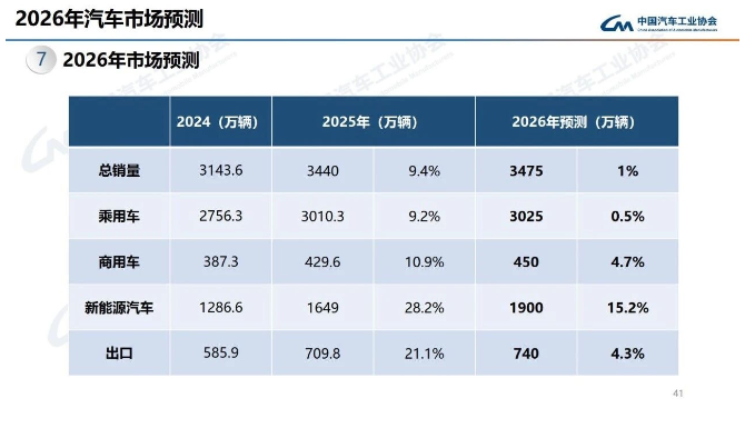 與此同時(shí),中汽協(xié)對(duì)2026年汽車市場進(jìn)行了預(yù)測(cè)。2026年,預(yù)計(jì)國產(chǎn)汽車總銷量將達(dá)到3475萬輛,微增1%。其中,乘用車預(yù)計(jì)為3025萬輛,微增0.5%;商用車預(yù)計(jì)為450萬輛,小幅增長4.7%;新能源汽車預(yù)計(jì)為1900萬輛,增長15.2%;汽車出口量預(yù)計(jì)為740萬輛,小幅增長4.3%。