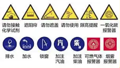 滅火器標(biāo)志必須貼在車門旁或廚房附近等滅火器存放處,要求標(biāo)志尺寸不小于10厘米見方,以確保在光線較暗的情況下也能快速找到;