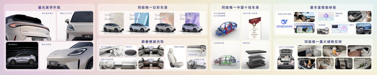 步入“舒嶼座艙”,細(xì)節(jié)皆巧思。繽果S以“靜奢棲居美學(xué)”為靈感,通過環(huán)抱式布局、貫穿式內(nèi)嵌風(fēng)幕與柔感貝殼座椅等設(shè)計(jì),營造出沉浸式的舒適氛圍。搭配同級(jí)唯一的6揚(yáng)聲器系統(tǒng)與阿嘉米斯專業(yè)聲場(chǎng)調(diào)校,進(jìn)一步提升了座艙的靜謐質(zhì)感與聽覺享受。12.8英寸高清大屏內(nèi)置“1+N”靈語AI中樞大模型,深度融合DeepSeek大模型,以更全面的壁紙玩法、八大區(qū)域的方言溝通、更多的智能場(chǎng)景應(yīng)用,為用戶帶來真正“更懂你的”智能座艙體驗(yàn)。