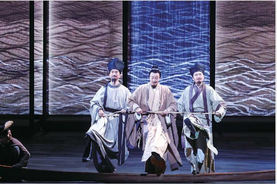 記者:舞臺上有一場戲堪稱絕妙:一葉扁舟上,蘇軾、王安石、司馬光三人上演的“盜夢空間”式“跨越時空”的對話,比如處理水患災(zāi)情時,蘇軾要召開新聞發(fā)布會,甚至說要開直播……這些看似隨意甚至荒唐的表達(dá)和演繹,給觀眾帶來一種新鮮的、自由開放的演劇體驗觀。劇中有借鑒中國戲曲中的可變性、流動性、空間結(jié)構(gòu),也有借鑒西方戲劇的多種技巧,這樣非線性、開放式敘事結(jié)構(gòu),有著怎樣的匠心?