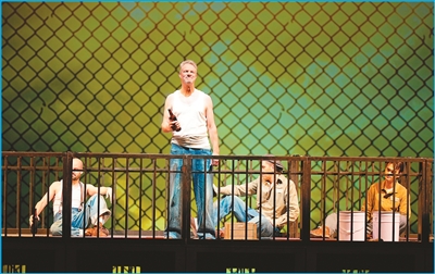 坐滿(mǎn)觀眾的劇場(chǎng),大幕拉開(kāi),燈光追隨,被判謀殺罪的銀行家安迪由獄警押解上場(chǎng)。身后的鐵牢籠里傳出起哄聲:“看吶,來(lái)新人了!”……