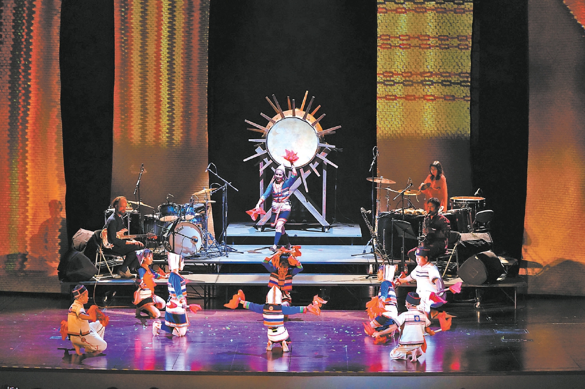 10月12日晚,一場將云南深山原始生命力融合跨越時空藝術(shù)想象力的演出登上北京舞臺。作為第二十八屆北京國際音樂節(jié)的重磅演出之一,由普利策音樂獎得主、華人作曲家杜韻傾力創(chuàng)作,北京國際音樂節(jié)與美國林肯中心聯(lián)合委約的音樂劇場作品《刻在森林的?!吩诒本┫矂≡菏澜缡籽荨碜栽颇衔麟p版納的非遺項目基諾族大鼓舞傳承人何桂英,帶領(lǐng)8位基諾族少年,在舞臺上敲響大山里特有的聲音。