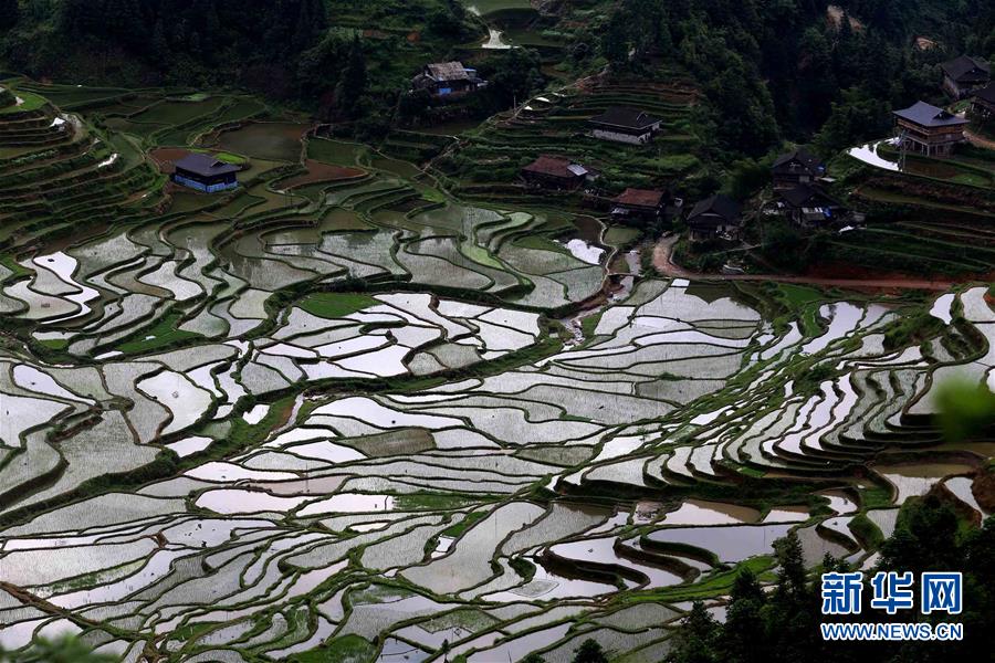 5月20日在廣西柳州市融水苗族自治縣桿洞鄉(xiāng)拍攝的梯田。廣西柳州市融水苗族自治縣桿洞鄉(xiāng)平均海拔780多米,是全縣高海拔鄉(xiāng)鎮(zhèn)之一。這里的梯田多在高山,人們稱之為“天上糧倉”。時下,“天上糧倉”或儲水待插,或新秧初栽,如織錦一般美不勝收。新華社發(fā)(龍濤 攝)