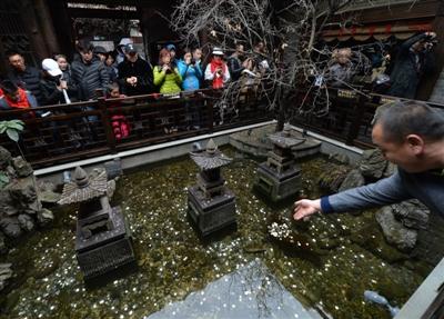 中午時分,記者又一次仔細(xì)觀察了水池,在游人拋投硬幣時,確實有一兩條金色的觀賞魚在石縫處游動著。在木制欄桿四周,正貼著“禁止倚靠欄桿”、“禁止投幣”等字樣?!按汗?jié)游客爆滿,水池是從寬巷子到窄巷子的必經(jīng)之道,加上很多人在拋硬幣,頓時人滿為患。我們只好打印了幾張?zhí)嵝褟堎N起來。”辦公室工作人員還表示,“等春節(jié)游客潮稍微退卻,天氣回暖,我們就要派人下水打撈這些硬幣,用于景點建設(shè)。”