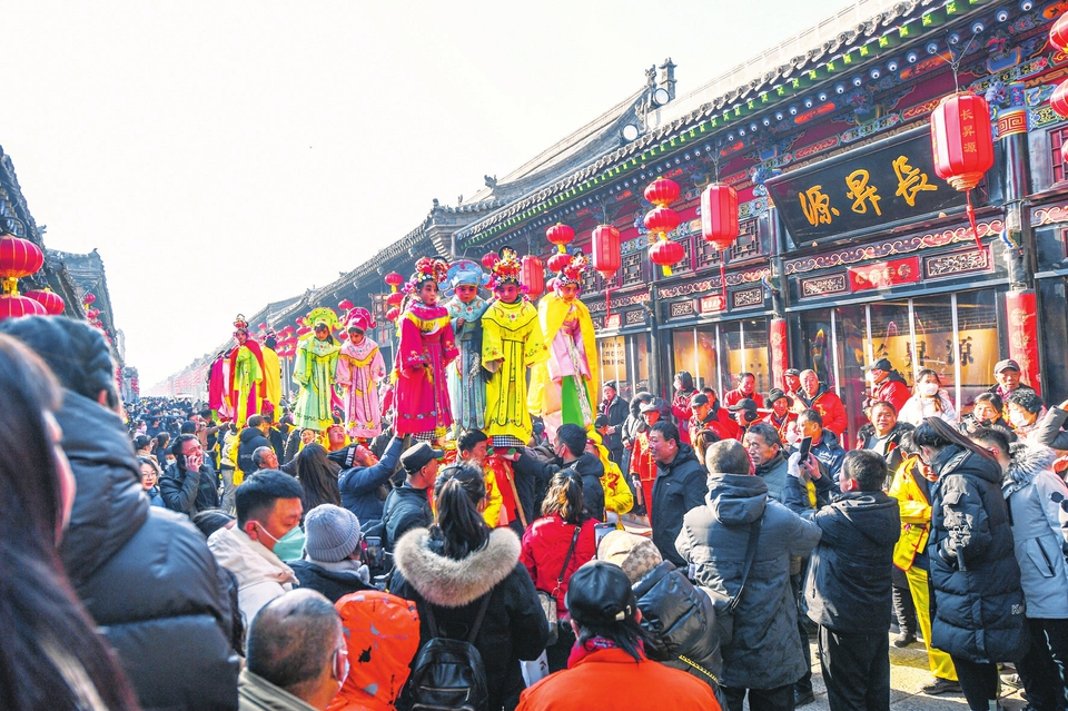 1月31日,游客在平遙古城觀看民俗社火表演。元宵節(jié)臨近,平遙古城內舉行具有當地特色的民俗展演活動,熱熱鬧鬧迎元宵。