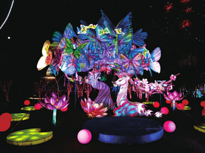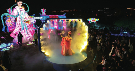 在百花的傳說中,十二月令花神的傳說最令人神往。在桃花島上,梅花、杏花、桃花、牡丹、石榴、蓮花、蜀葵、桂花、菊花、木芙蓉、山茶、水仙,各路花神身著華服,在所屬花燈前翩翩起舞,燈光人影交織,盡顯浪漫?!笆ㄉ瘛泵客矸謺r段在桃花云臺,跳起如云似幻的祈福舞,笑容明媚,面若桃紅,傾倒眾人。無人機組集合成孔明燈形狀,載著每個人最虔誠的心愿緩緩升空?!笆ㄉ瘛彪S即走下“神臺”,出沒在各個角落,讓整個桃花島亦真亦幻。穿行其中,與“花神”擦肩而過,仿佛穿越時空,進入神話世界。