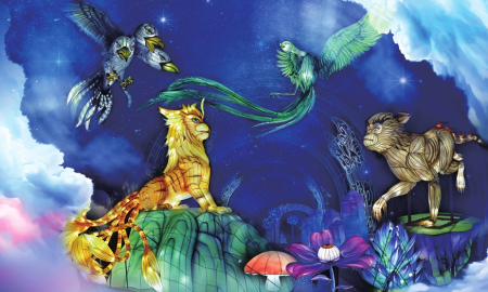 奇幻風(fēng)格的桃花路上,《山海經(jīng)》中的仙山海景和祥瑞神獸也來助陣。渾身毛發(fā)雪白的九尾狐,三頭六尾名叫鵸的鳥妖、吼聲震天名叫狌狌的犲山獸、立于昆侖山巔遙望東方的陸吾、三首六尾夜半怪笑的鵸鵌、悠然自得的麋鹿、充滿神秘色彩的青鸞、抬腿準(zhǔn)備騰云的飛馬……置身其中,仿佛斗轉(zhuǎn)星移,滄海桑田。地面的點點星光,營造出神秘夢幻的奇趣山海世界。