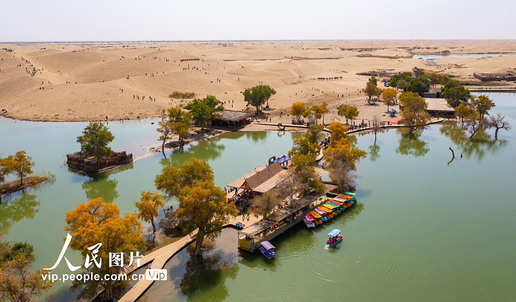 2023年10月5日,在新疆巴音郭楞蒙古自治州尉犁縣羅布人村寨景區(qū),游客們?cè)诖竽?、綠洲、湖泊的美景中暢游,駱駝騎行、沙漠越野、劃船、滑沙成為不少游客的首選。