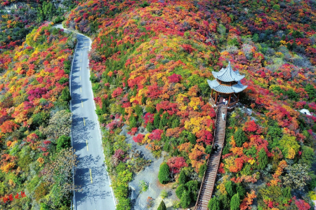 龍山、太山景區(qū)位于風光秀麗、重巒疊翠的太原西山,東臨晉陽古城遺址,西接天龍山風景區(qū),盤繞在崇山峻嶺之中,是太原西山文化帶的璀璨明珠,集豐富的歷史遺存與優(yōu)美的自然景觀為一體。每年深秋,秋葉臨霜而紅,層林盡染,漫山紅遍。聞名遐邇的“西山紅葉”正逢盛季,萬畝紅葉流丹似火。龍山、太山紅葉,是太原西山地區(qū)分布面積最大、最為集中的紅葉觀賞地。游客順著山勢拾級而上,山巒環(huán)抱的山坳里、溝谷中、山脊上,一團團一簇簇,或紅或橘,或黃或綠,仿佛置身大自然的畫盤之上。