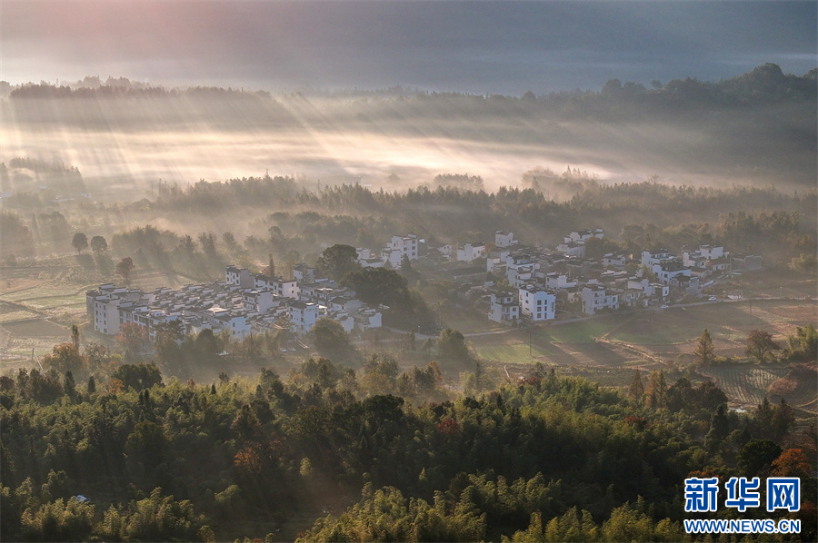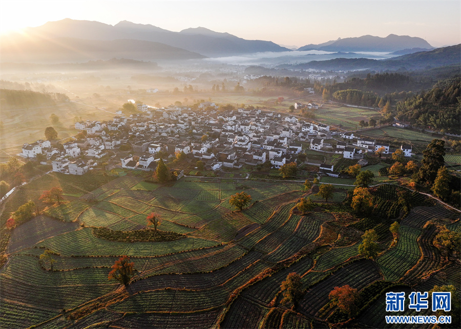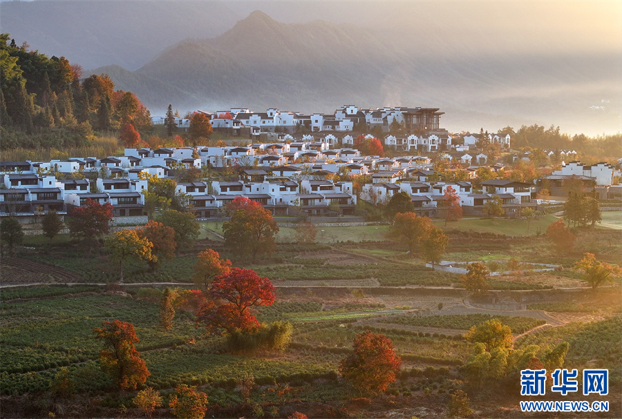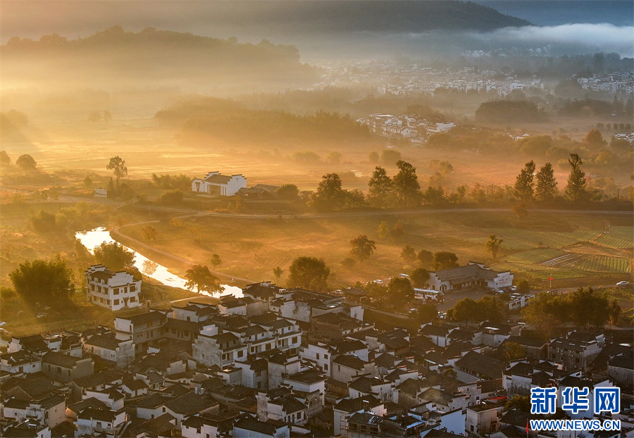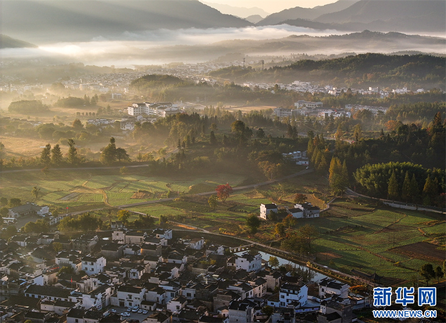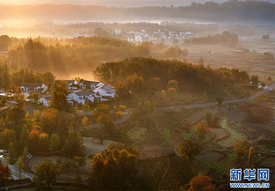 當(dāng)日,安徽省黃山市黟縣宏村、盧村等地晨霧縹緲,秋色斑斕,粉墻黛瓦掩映其中,宛如一幅幅繽紛多彩的油畫(huà)。 新華網(wǎng)發(fā)(施亞磊 攝)