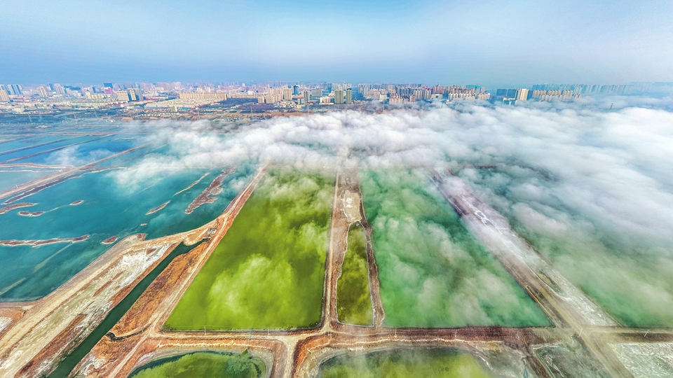 3月11日,因連日來天氣晴好,晝夜溫差大,運城市中心城區(qū)和鹽池上空出現(xiàn)平流霧景觀,七彩的鹽池在霧氣下若隱若現(xiàn),形成一幅無與倫比的美麗畫卷。據(jù)了解,平流霧是沿海暖濕空氣水平流經(jīng)寒冷地面或水面時,導致下部冷卻而形成的云霧。