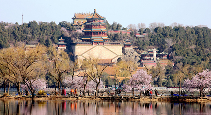 2024年3月19日,北京頤和園西堤,山桃花爭(zhēng)相盛開,與古建亭橋相映成景。丁幫學(xué)攝(人民圖片網(wǎng))