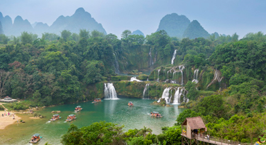 德天瀑布位于廣西壯族自治區(qū)崇左市大新縣碩龍鎮(zhèn)德天村,中國與越南邊境處的歸春河上游。瀑布?xì)鈩莅蹴?、蔚為壯觀,與緊鄰的越南板約瀑布相連,是亞洲第一、世界第四大跨國瀑布。劉國興攝(人民圖片網(wǎng))
