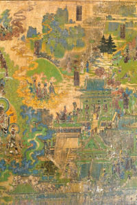 但巖山寺金代壁畫有確切年代,是御前承應(yīng)畫匠王逵用10年時間才完成這一煌煌巨制。800多年前,王逵面對四壁,決然舍棄慣常的連環(huán)畫形式,大膽?yīng)殑?chuàng),采用滿幅構(gòu)圖形式,以一組繁雜的宮廷建筑為中心,配以各種故事情節(jié)畫面,然后用山水、樹石、云嵐連結(jié),細部真實,透視準確,遠看儼然一幅氣勢磅礴的大型山水畫,近瞧卻又章回分明。壁畫上就有多處使用瀝粉堆金裝飾,顯現(xiàn)金碧輝煌、富麗非凡的效果。這樣大面積的工筆重彩畫,一絲不茍,找不到起稿與粉本痕跡,而且線條變化多樣,無一廢筆,令人驚嘆。