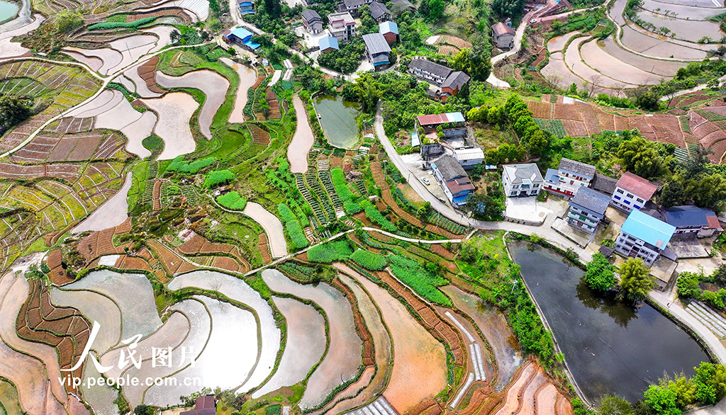 2026年4月1日,重慶墊江縣高峰鎮(zhèn)東風村,層疊的梯田與錯落的民居,繪出一幅春日田園畫卷。