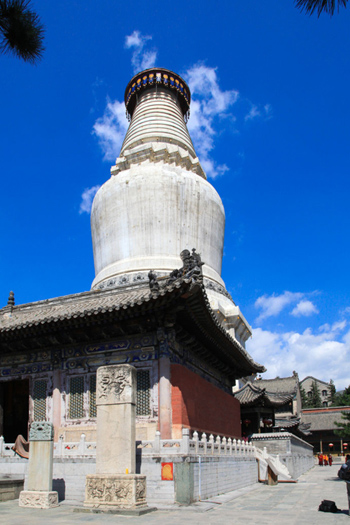 塔全稱為釋迦牟尼舍利塔,俗稱大白塔。塔身撥地而起凌空高聳,在五臺山群寺簇擁之下頗為壯觀,人們把它做為五臺山的標(biāo)志。此塔通高七十五點三米,環(huán)周八十三點三米。塔基為正方形,塔身狀如藻瓶,粗細相間,方圓搭配,造型優(yōu)美。塔頂蓋銅板八塊成圓形,按乾、坎、艮、震、巽、離、坤、兌等八卦地位安置。塔頂中裝銅頂一枚,高約五米,覆盤二十一米多,飾有垂檐三十六塊,長兩米多;每塊垂檐底端掛風(fēng)鐘三個,連同塔腰風(fēng)鐘在內(nèi),全塔共有二百五十二個。風(fēng)歡鈴動,叮鐺作響。
